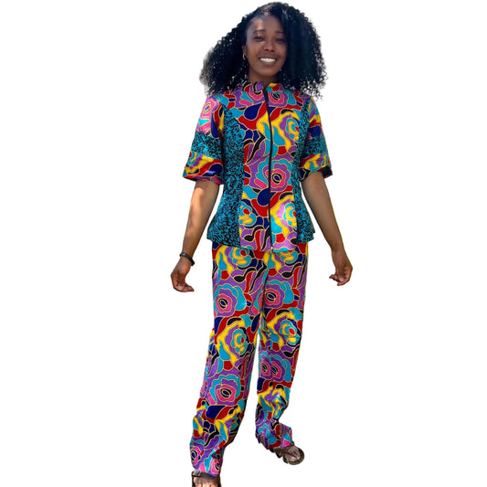African Ankara Print Floral Front Zip 2p Pant Set
