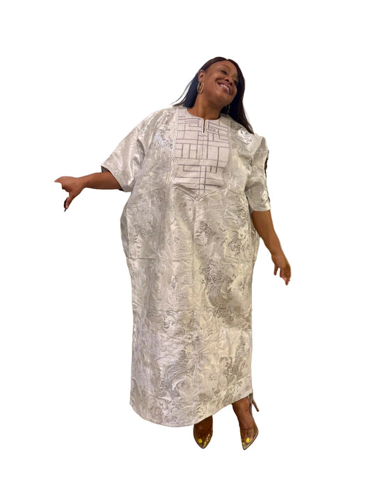 Embroidered White Damask Brocade Maxi Dress: African Boubou Gown