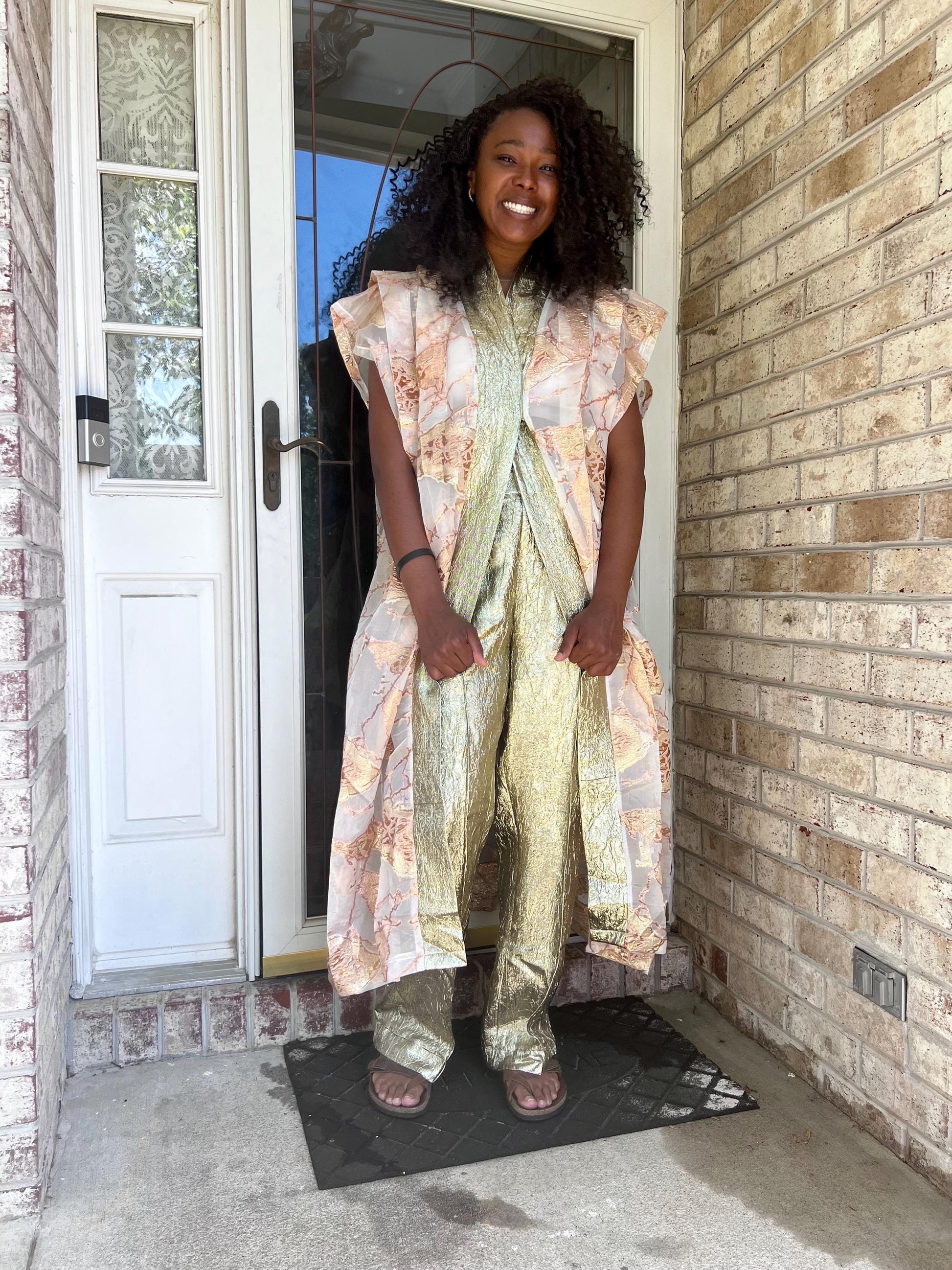 This Luxury Jacquard and Brocade is 2p pant set in Pink Blue and Bronze color. The top is adjustable free style with open front . Comfortable Women's Clothing with Relaxed Fit for Chic Style. Ideal for all special occasions. A must have.
