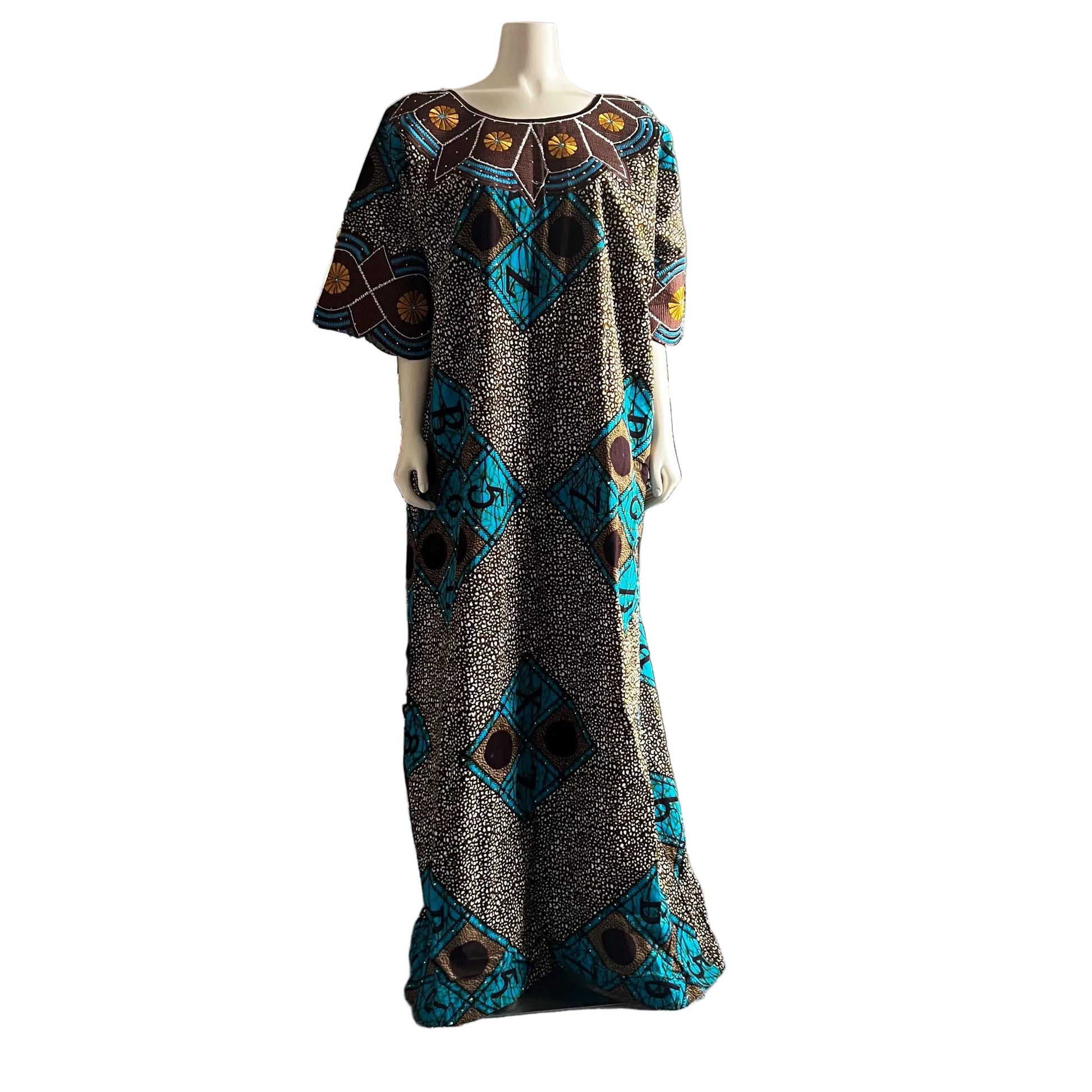 This colorful 100% African cotton Ankara Maxi Kaftan dress is a vibrant and eye-catching garment that showcases the rich cultural heritage and artistic traditions of Africa. This dress features bold and intricate geometric patterns, combination of Embroidery and stone embellishments. The use of 100% cotton fabric ensures that the dress is breathable, comfortable, and perfect for all weather.
