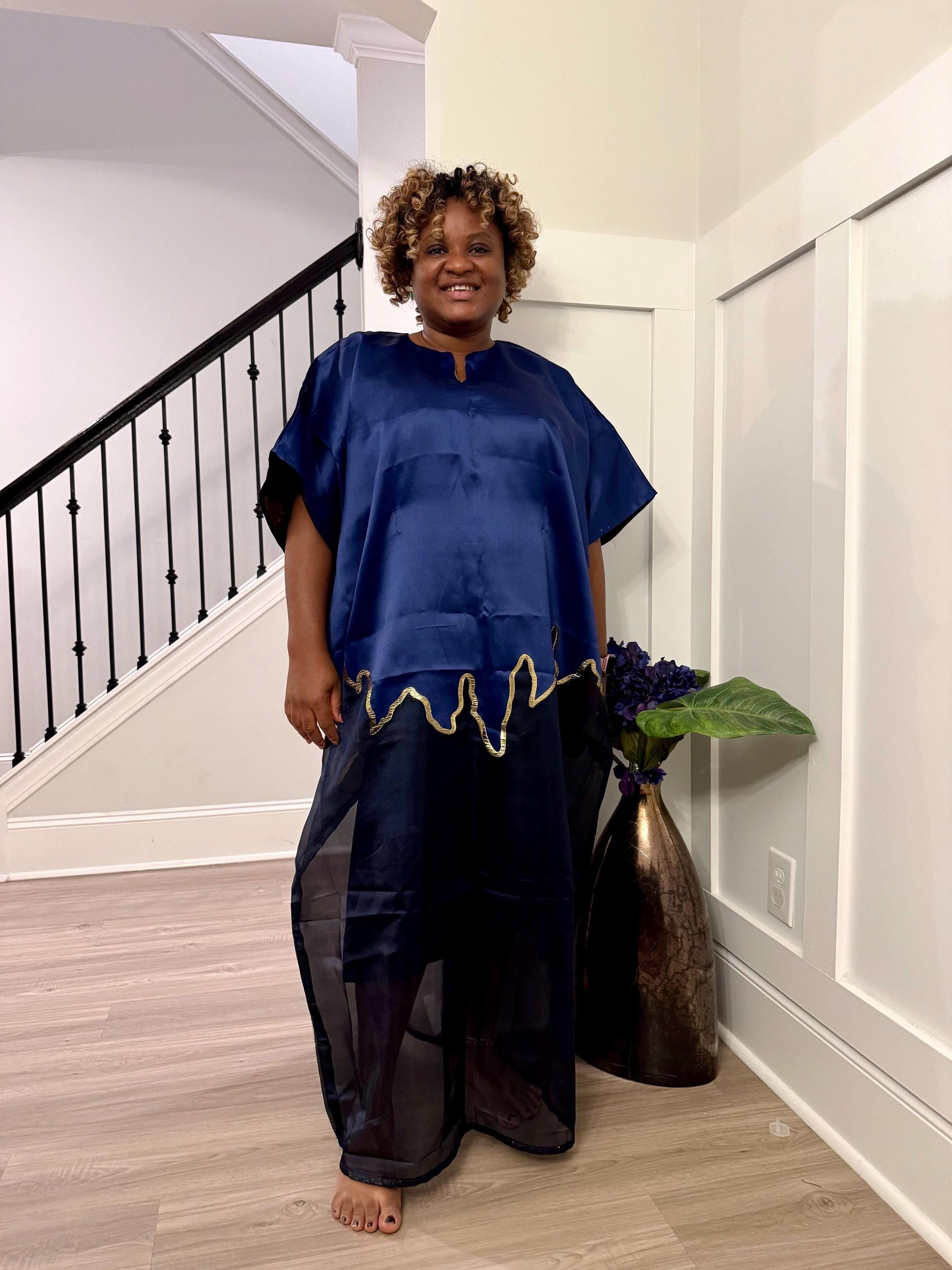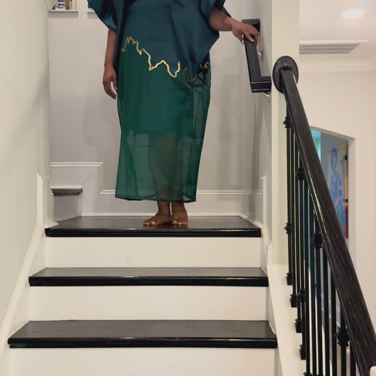 Make a stunning statement with this luxurious African-inspired maxi dress showcasing exquisite brocade. The elegant neckline and dramatic bell sleeves create a regal silhouette. The loose-fitting, flowing design offers both comfort and grace, while the contrasting black hem adds a polished finish. The bodice features a unique diagonal pattern that complements the overall design. Perfect for special occasions, formal events, or cultural celebrations, this maxi dress combines traditional aesthetics with contemporary style. The generous cut and premium fabric ensure a comfortable fit for various body types.
