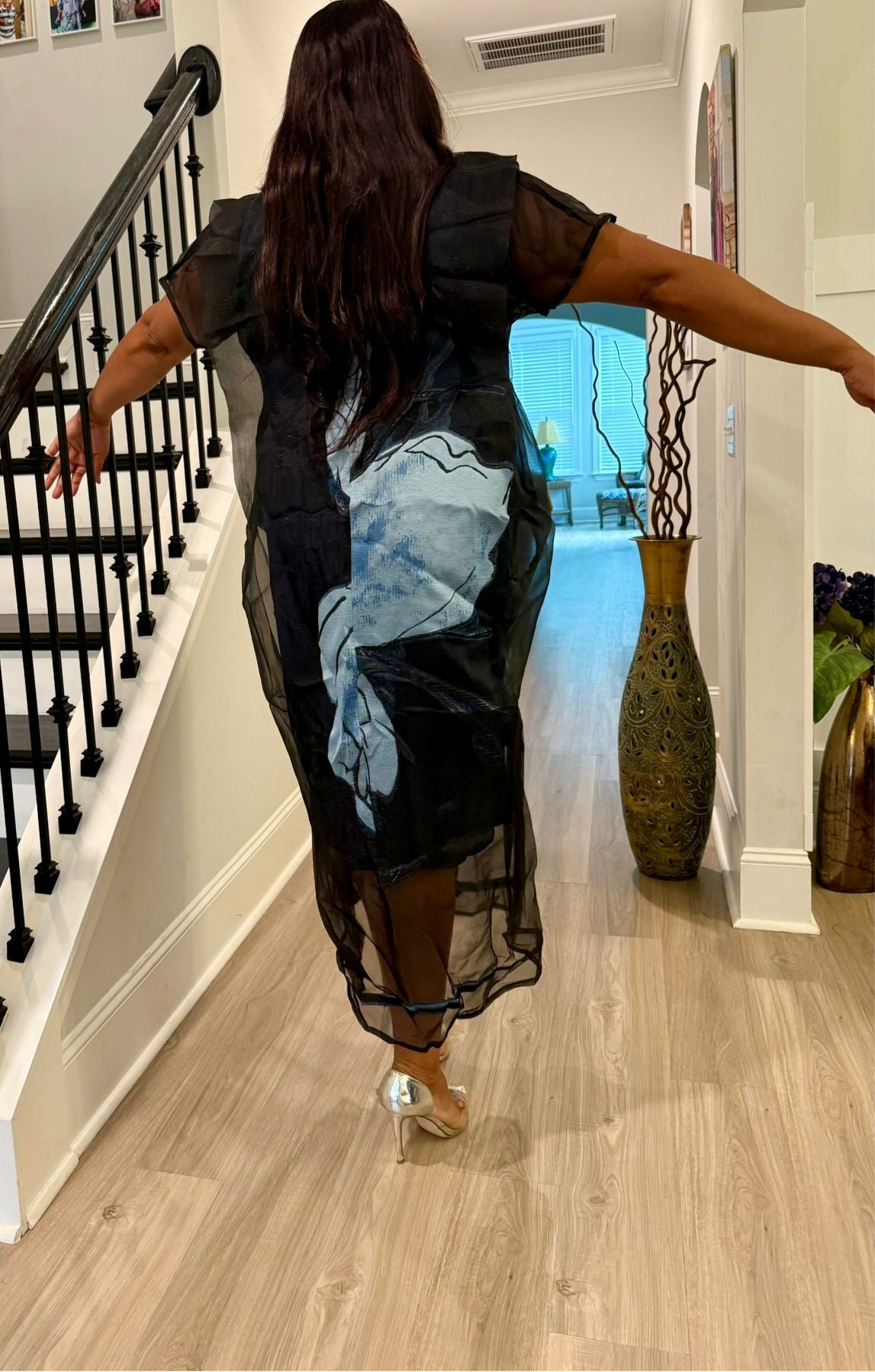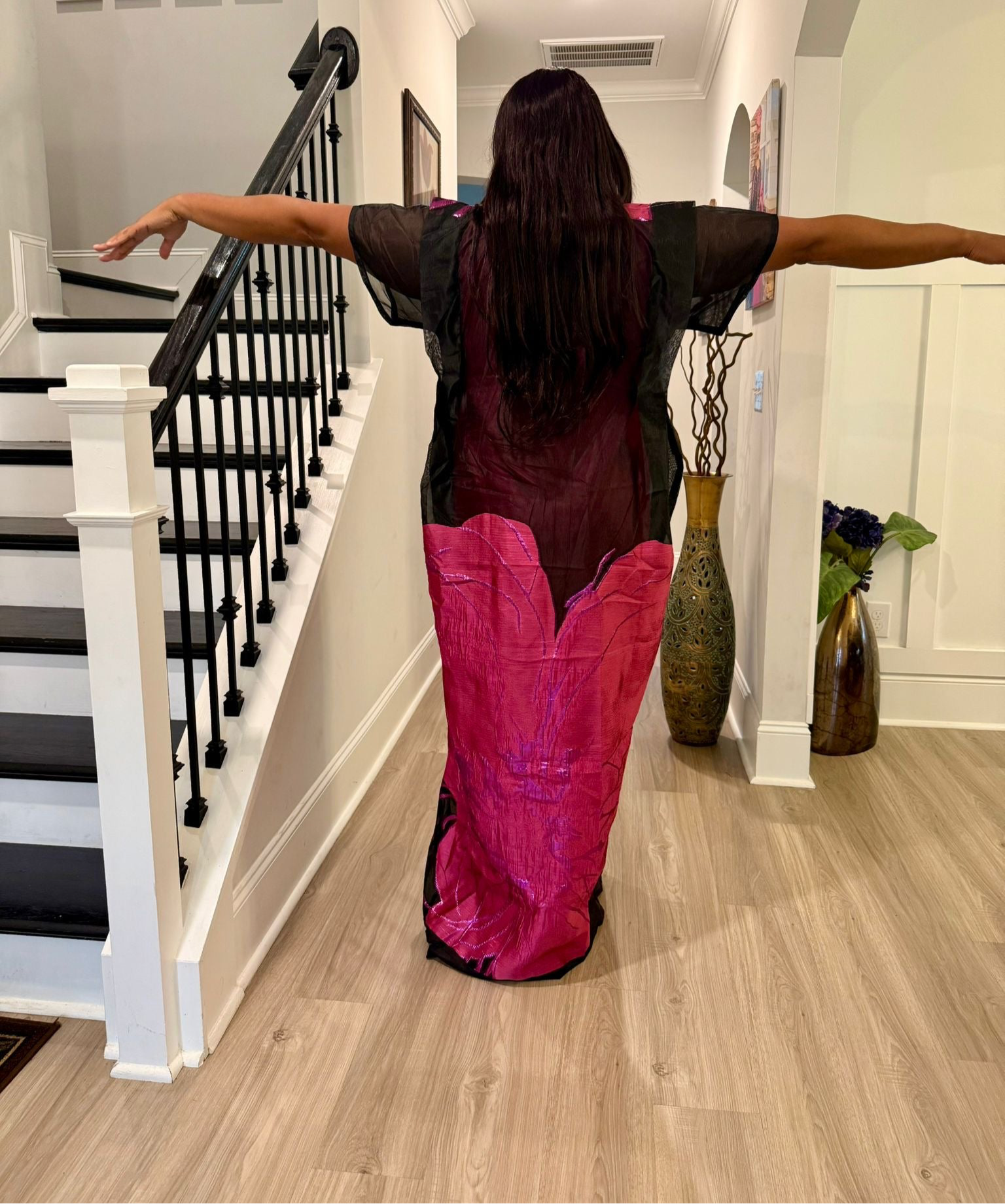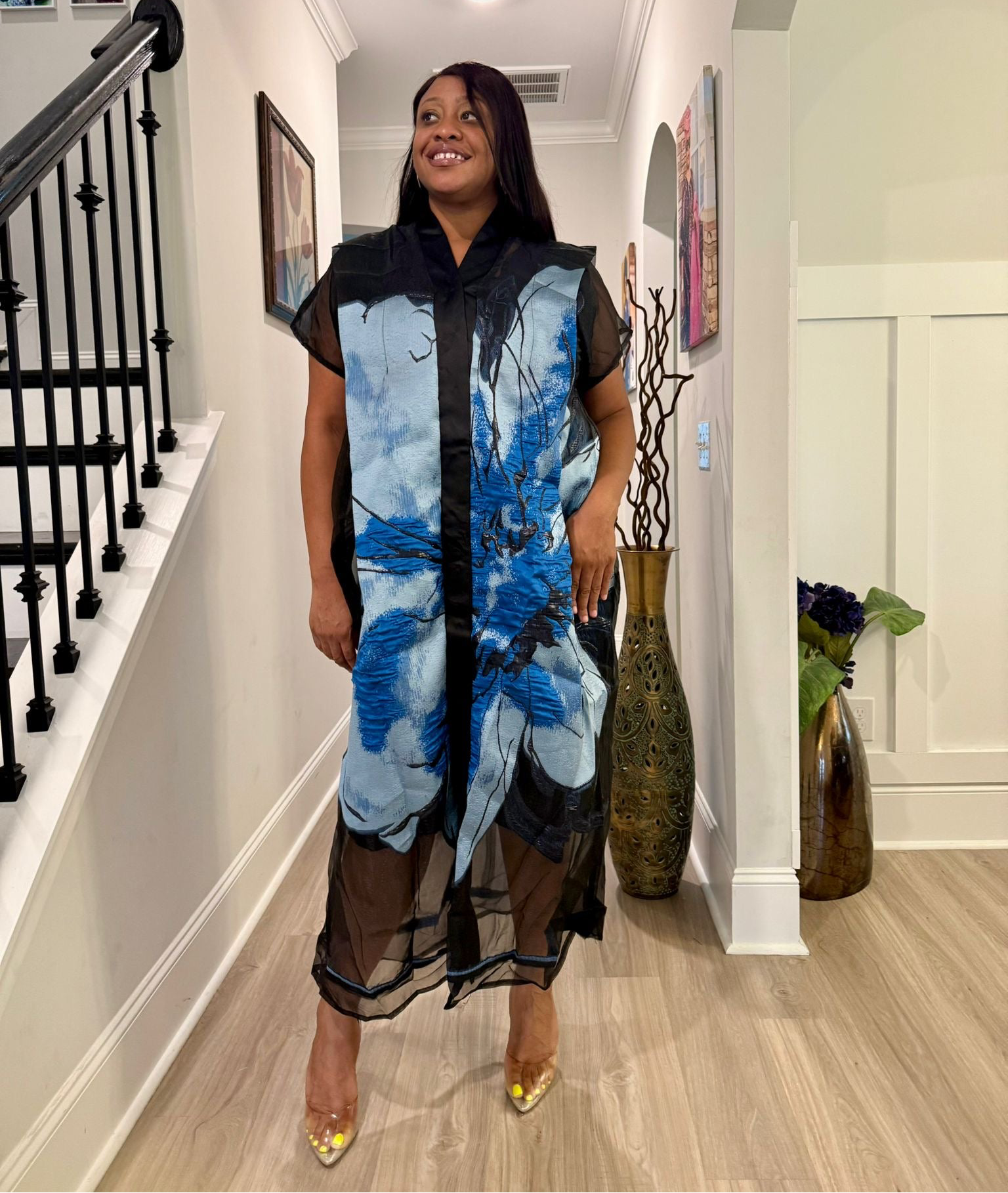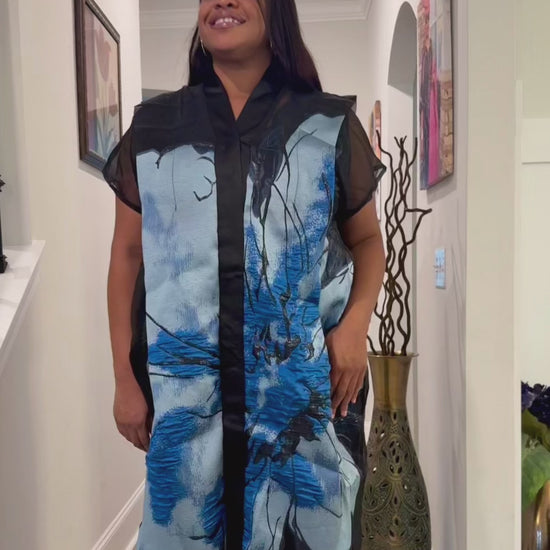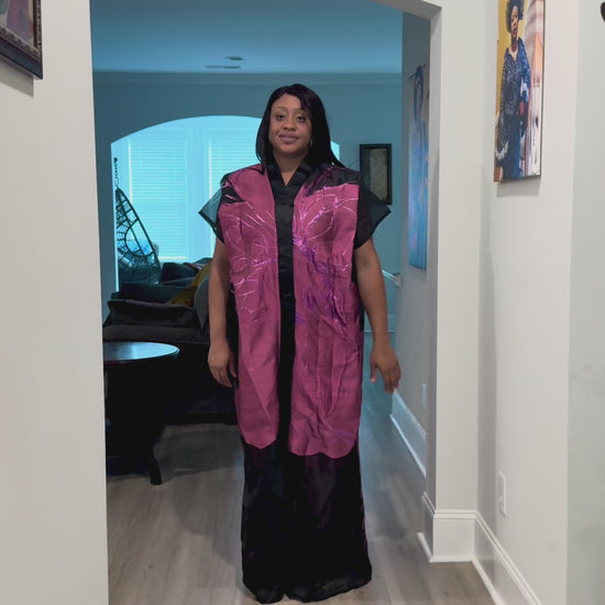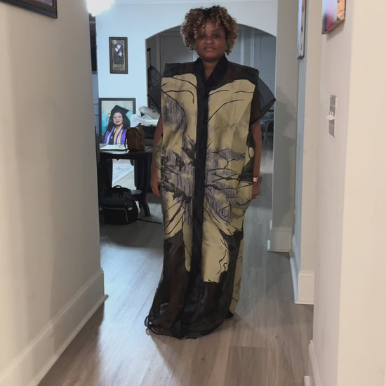 Make a stunning statement with this luxurious African-inspired maxi dress showcasing exquisite brocade . The elegant neckline and dramatic bell sleeves create a regal silhouette. The loose-fitting, flowing design offers both comfort and grace, while the contrasting black hem adds a polished finish. The bodice features a unique diagonal pattern that complements the overall design. Perfect for special occasions, formal events, or cultural celebrations, this maxi dress combines traditional aesthetics with contemporary style. The generous cut and premium fabric ensure a comfortable fit for various body types.