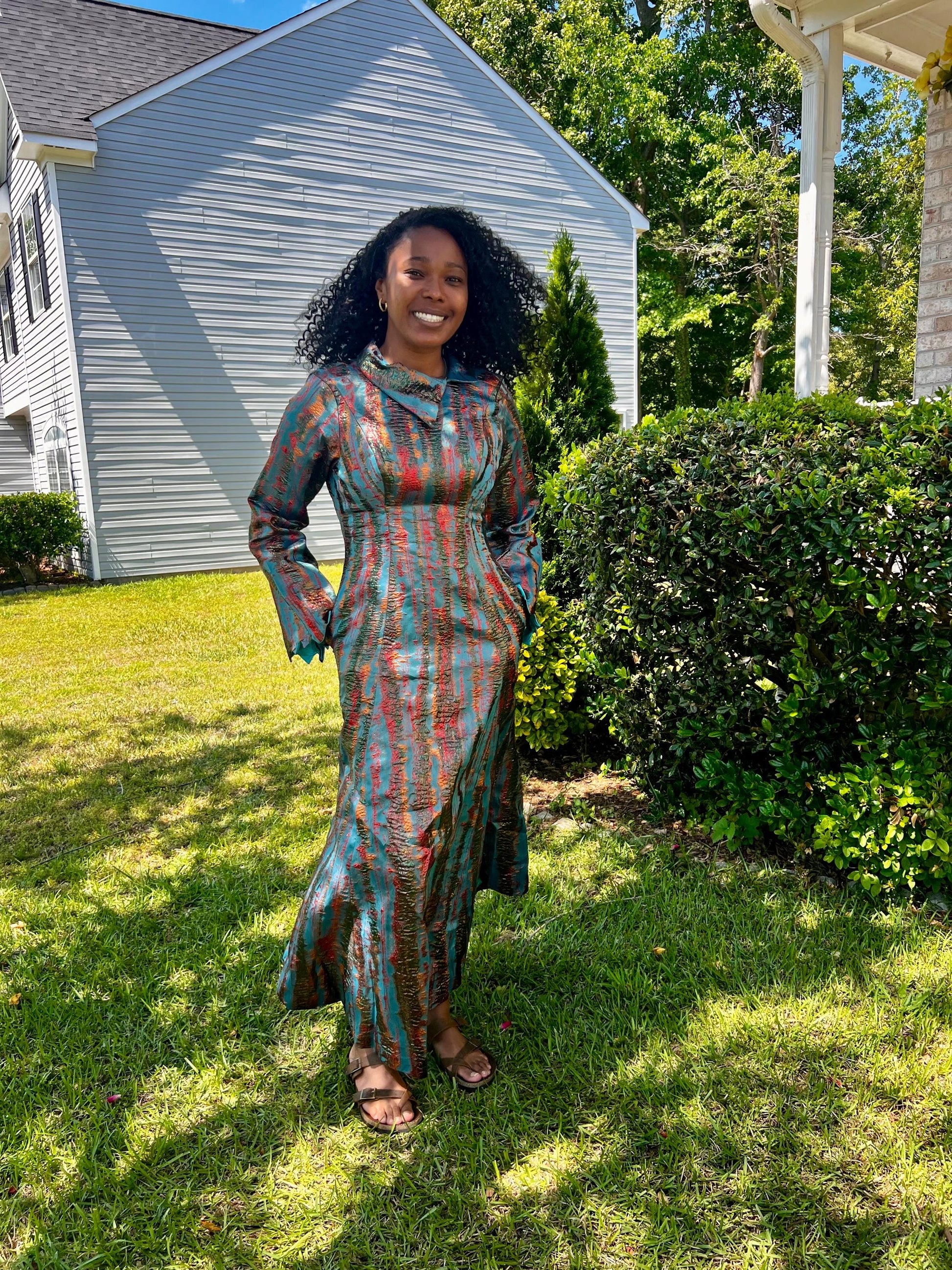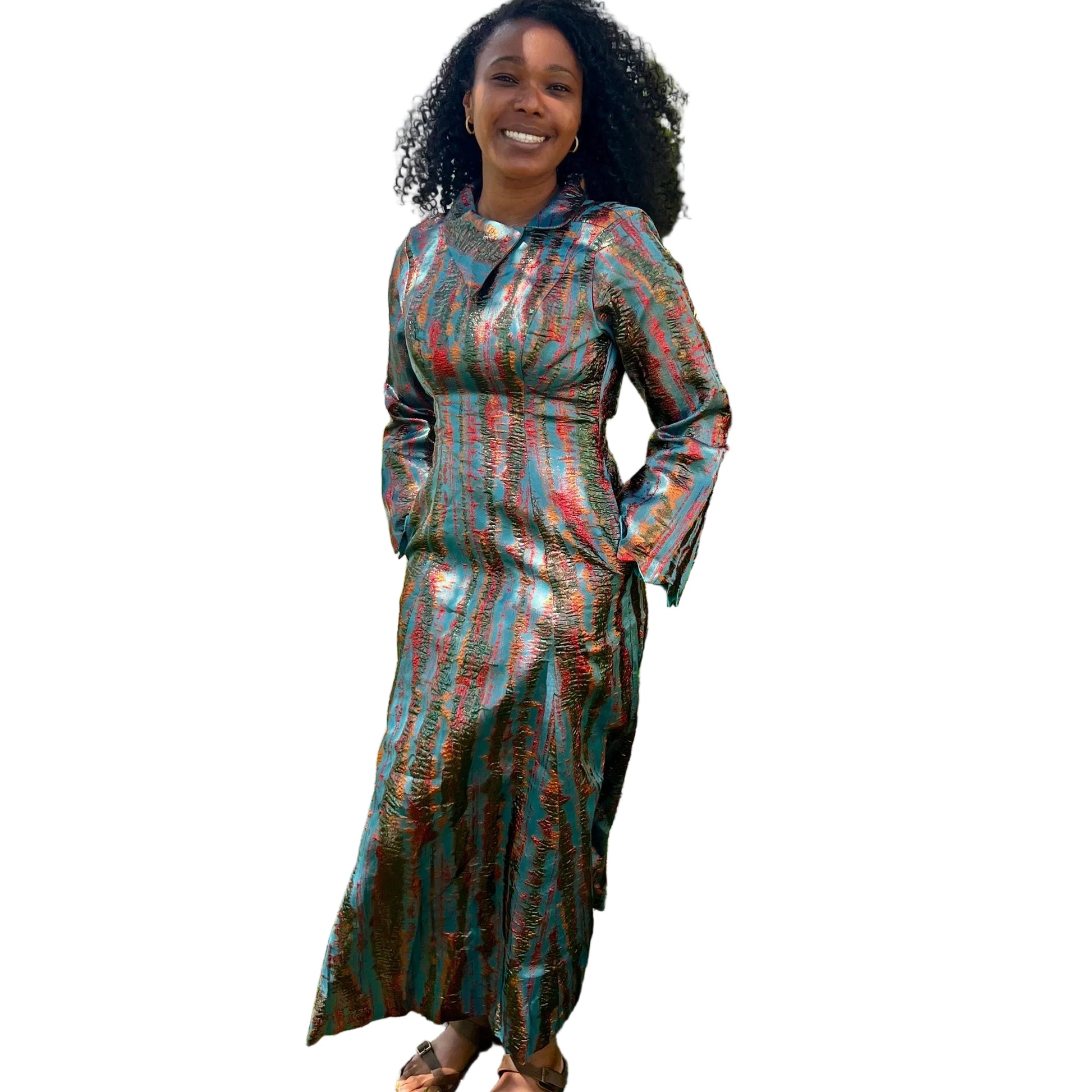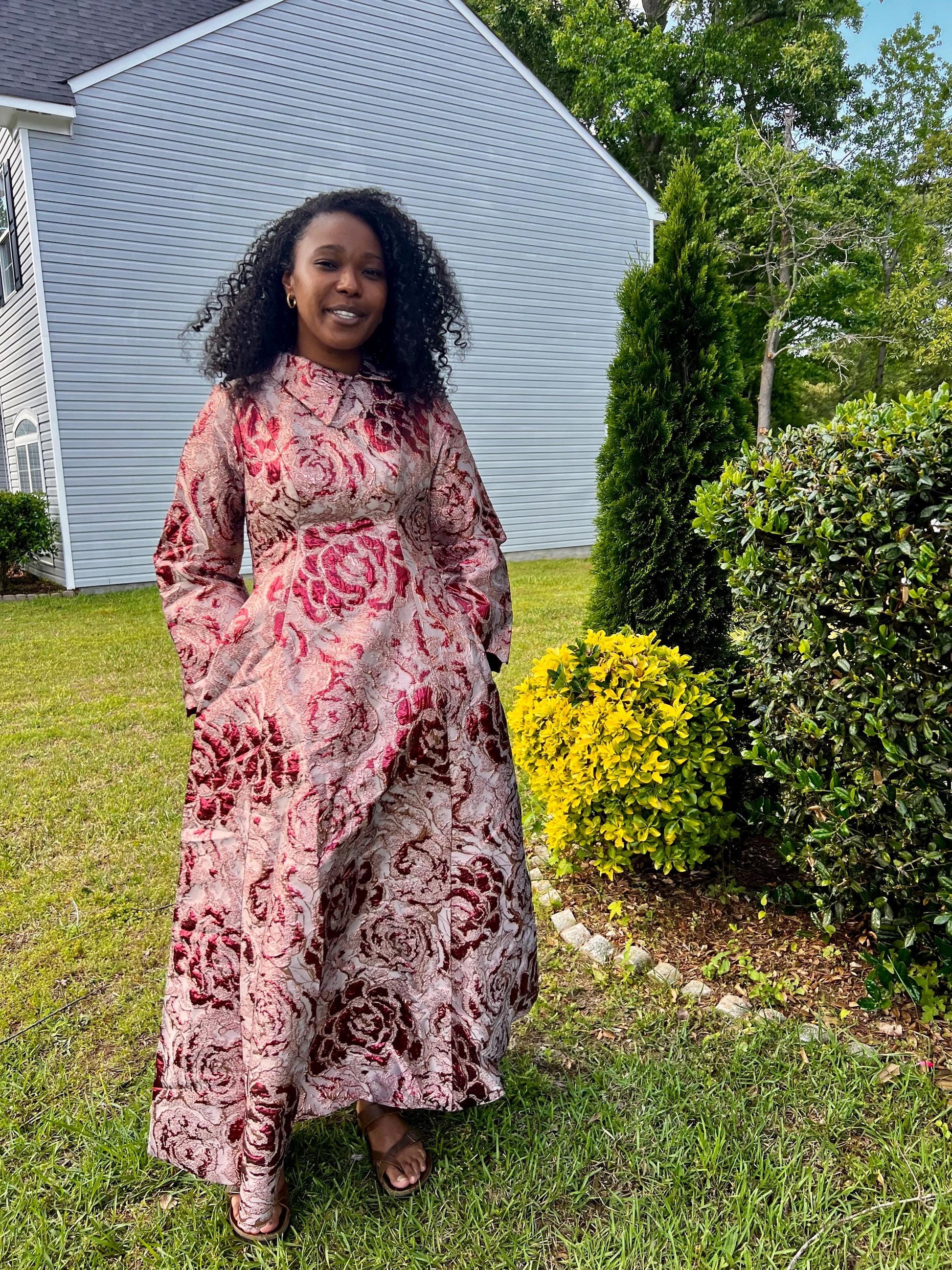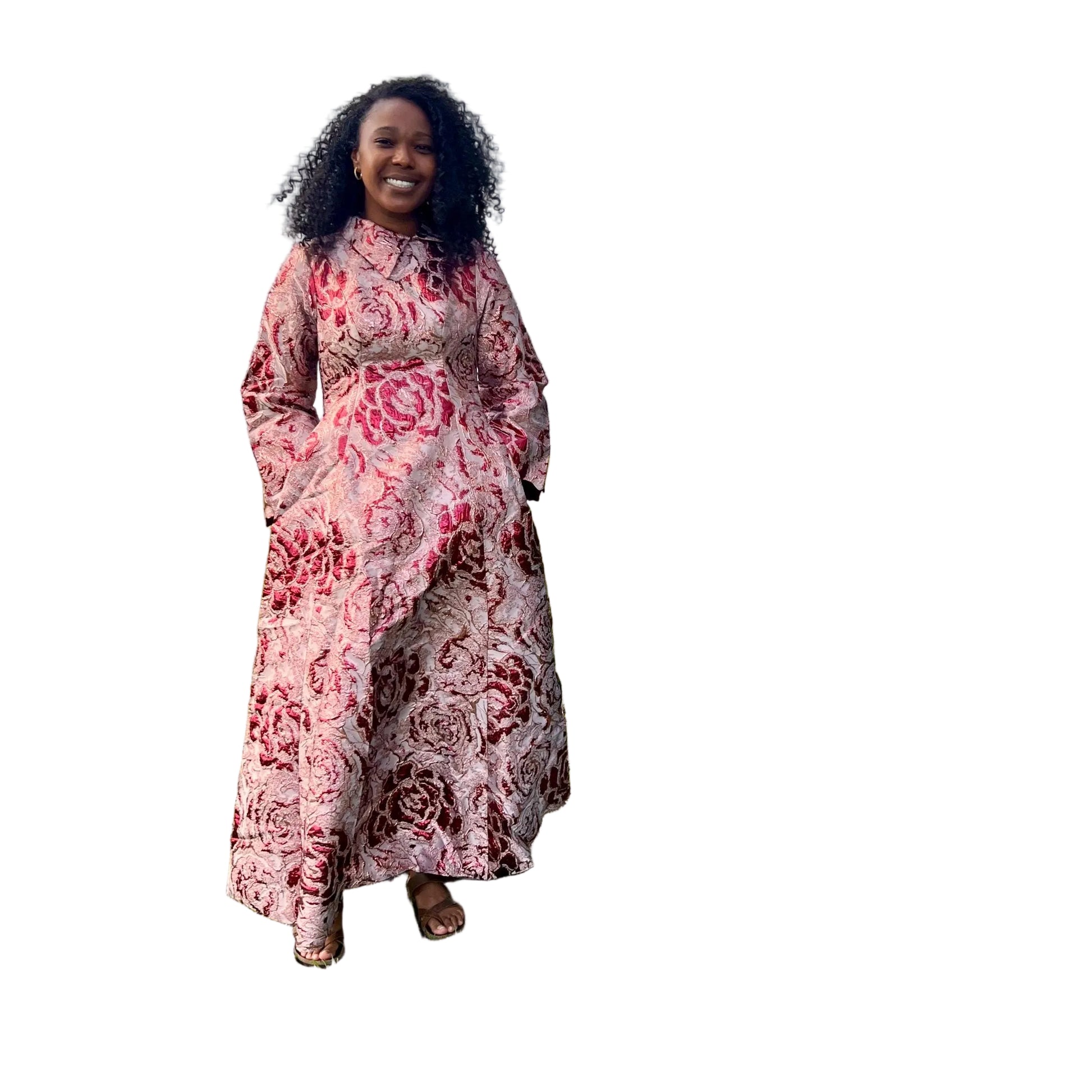 Step out in style with our stunning Timeless Brocade Full Length Dress. Perfectly tailored for elegance and comfort. This fit and flare dress with long bell sleeve is fully lined. Perfect for that special occasion. A must have.