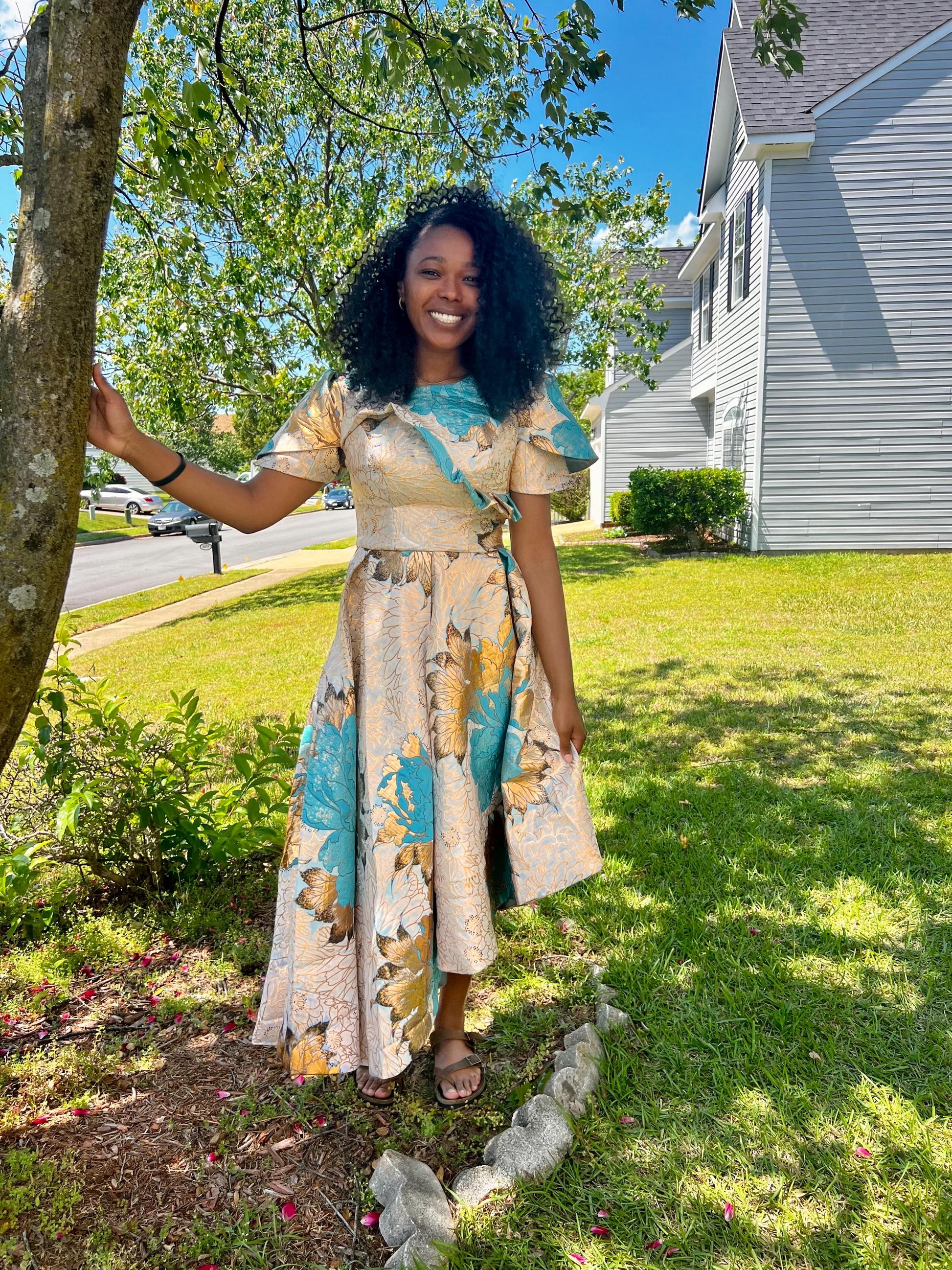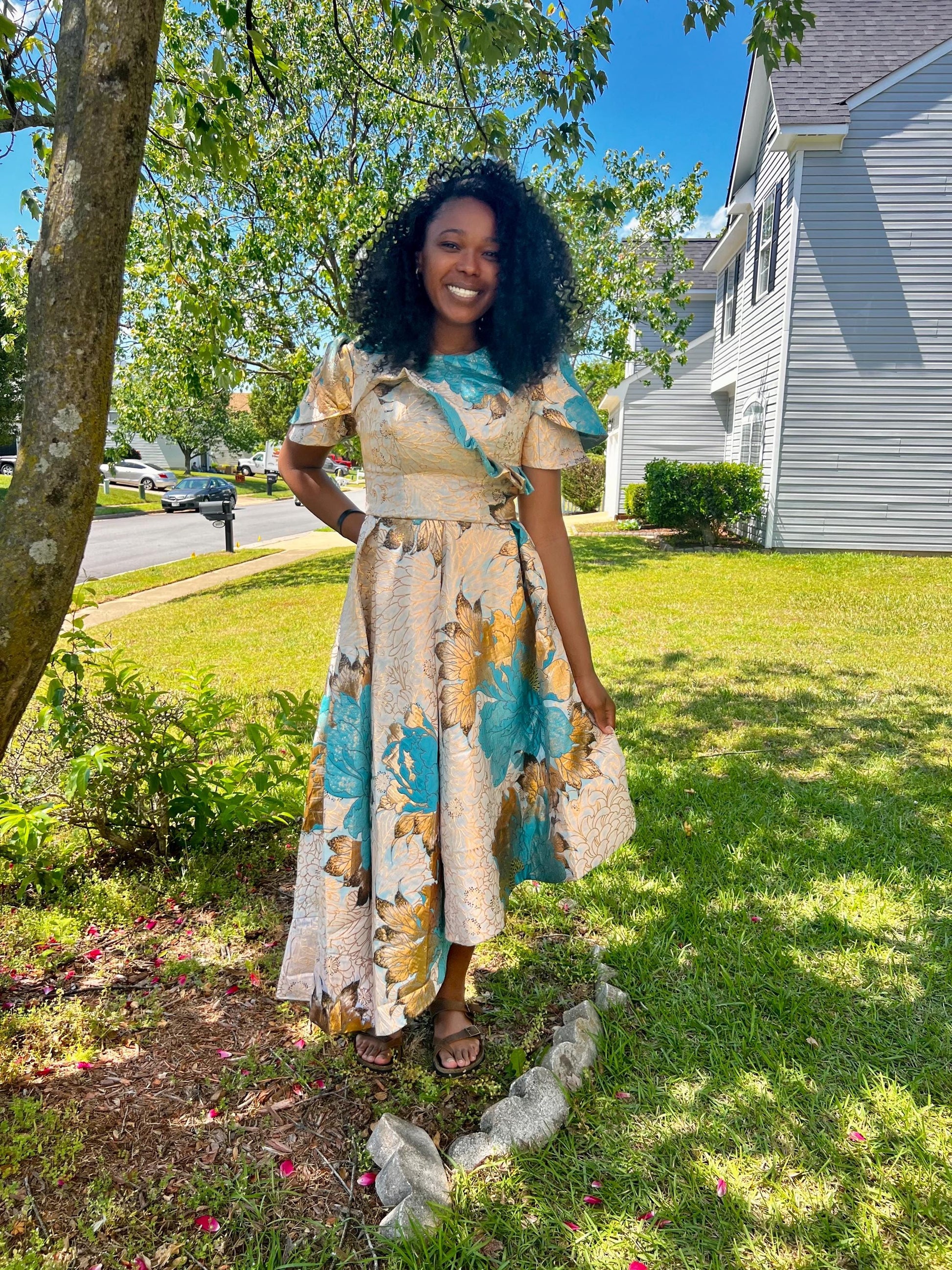 Luxury Damask Brocade kiss Sleeves Floral Dress