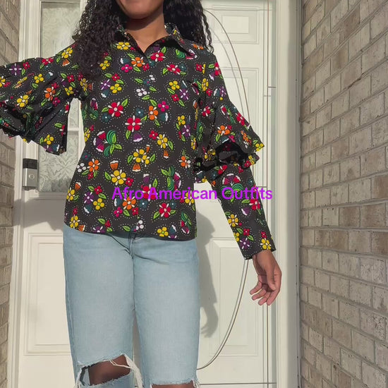 African Ankara Wax Print Floral Ruffles Hand Women Shirt Tops/Blouse