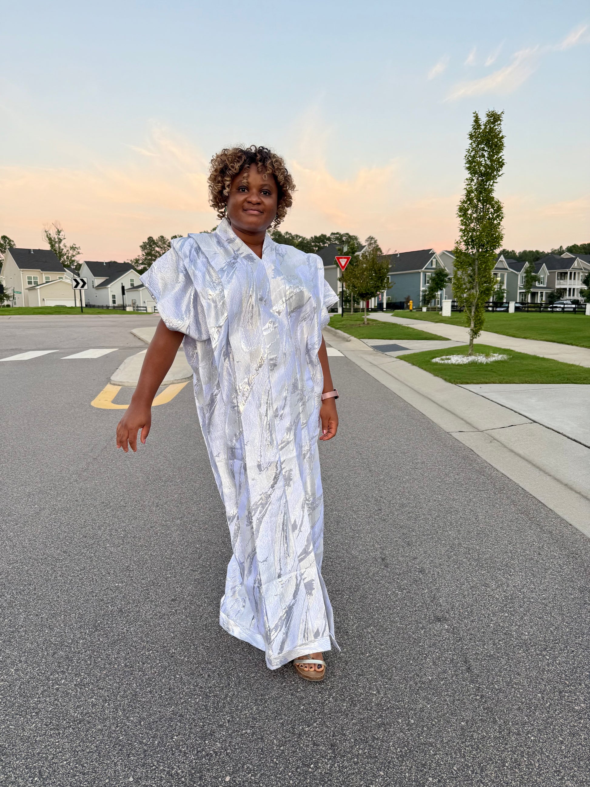 Make a stunning statement with this luxurious African-inspired maxi dress showcasing exquisite brocade. The elegant neckline and dramatic sleeves create a regal silhouette. The loose-fitting, flowing design offers both comfort and grace, while the contrasting black hem adds a polished finish. The bodice features a unique diagonal pattern that complements the overall design. Perfect for special occasions, formal events, or cultural celebrations, this maxi dress combines traditional aesthetics with contemporary style. The generous cut and premium fabric ensure a comfortable fit for various body types.