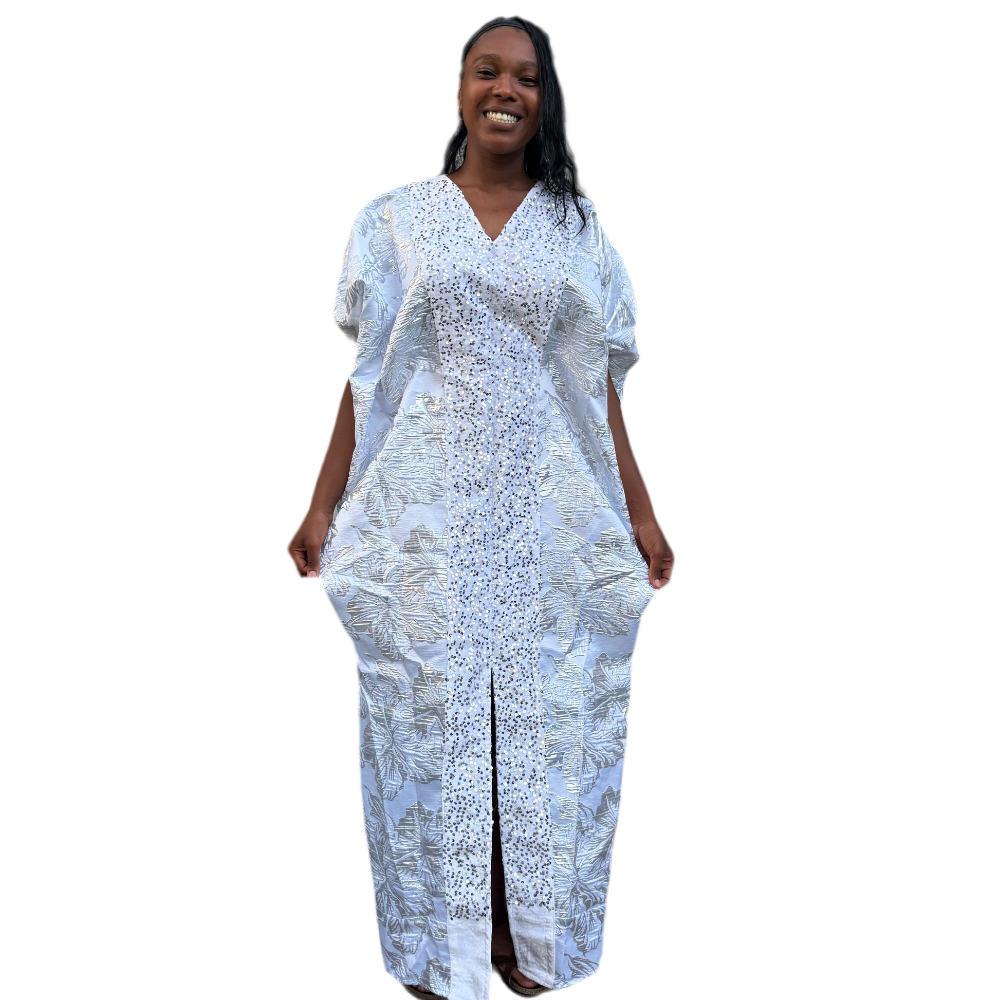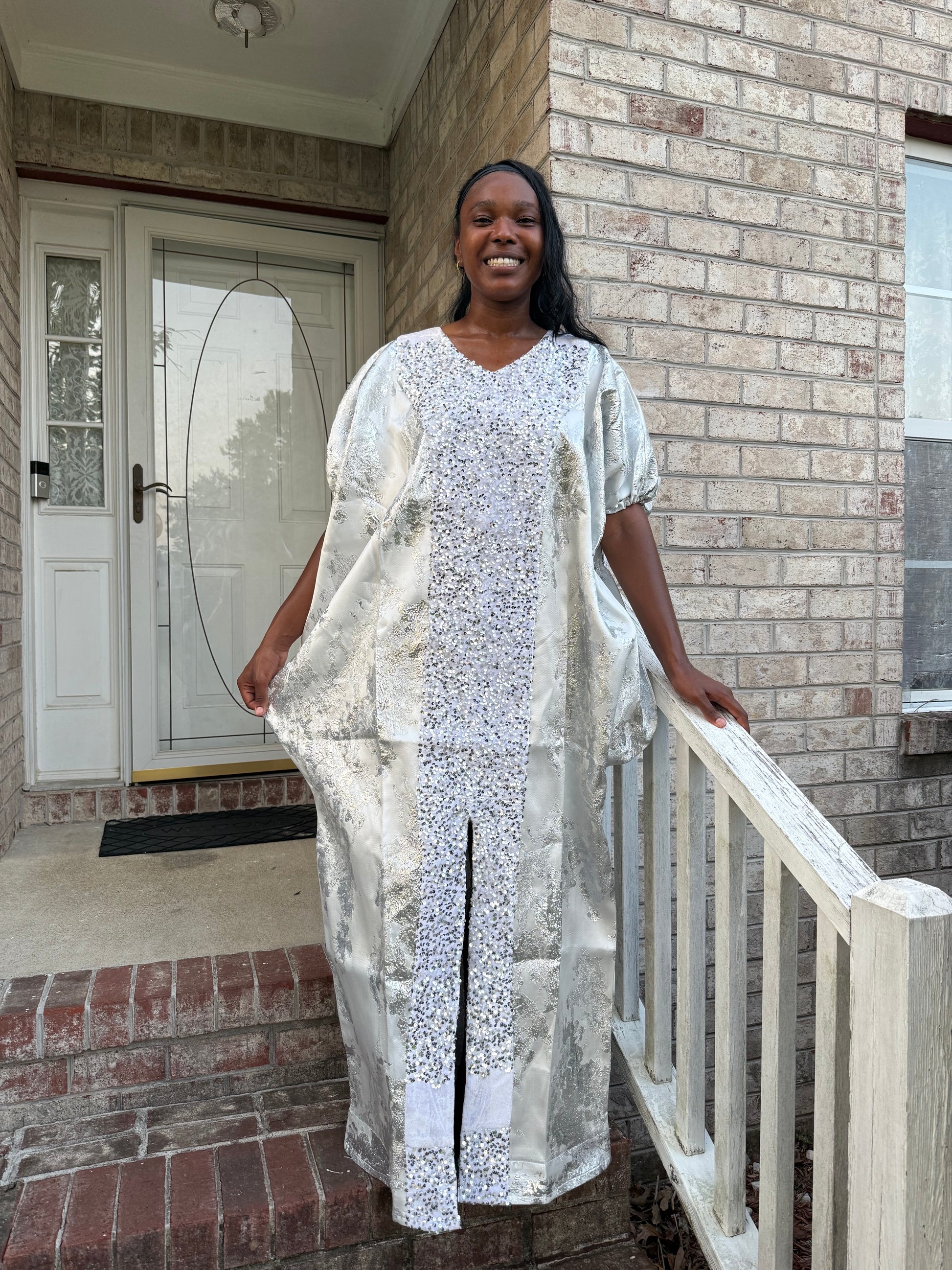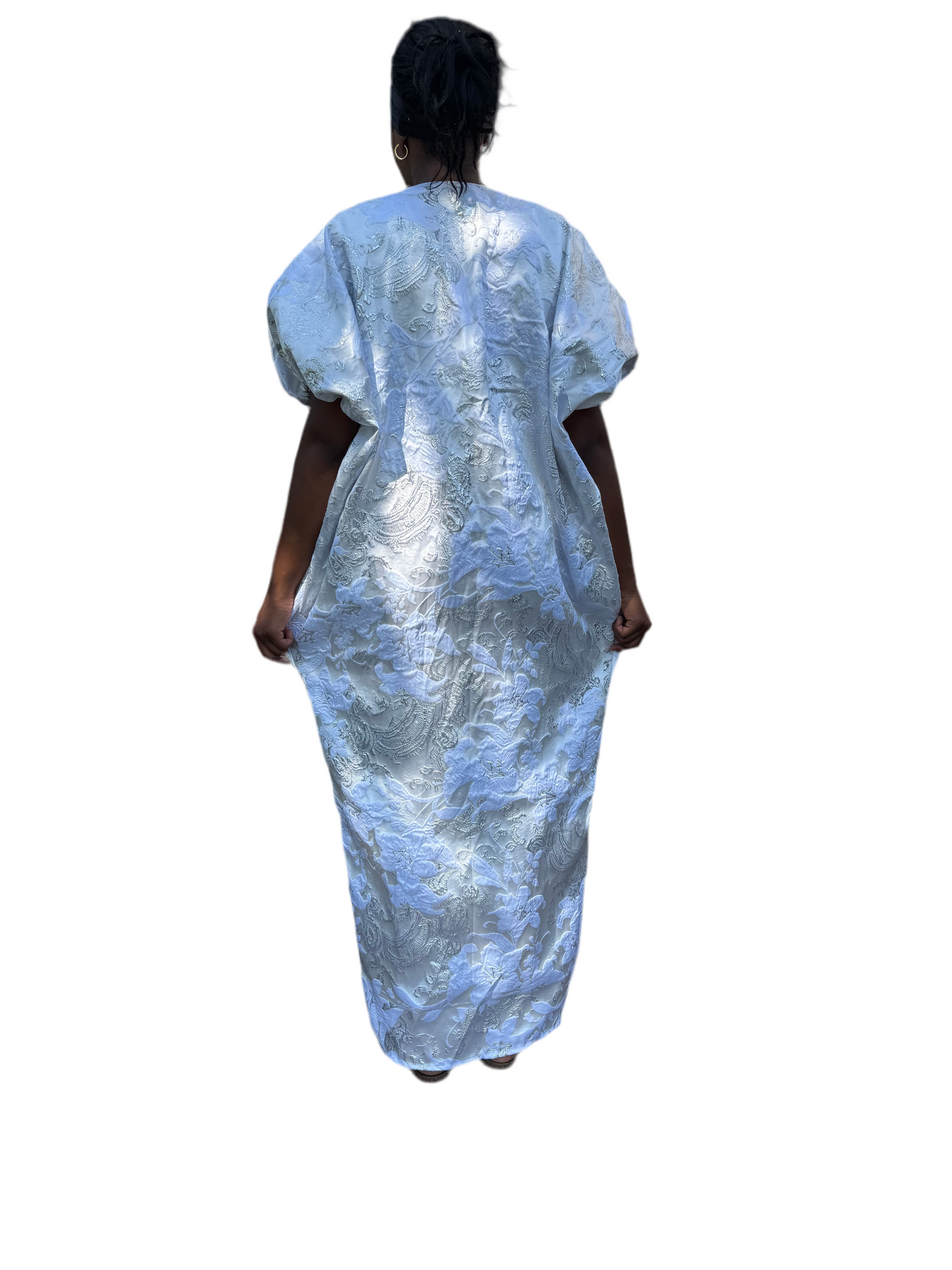 Make a stunning statement with this luxurious African-inspired maxi dress showcasing exquisite brocade . The elegant neckline and dramatic bell sleeves create a regal silhouette. The loose-fitting, flowing design offers both comfort and grace, while the contrasting black hem adds a polished finish. The bodice features a unique diagonal pattern that complements the overall design. Perfect for special occasions, formal events, or cultural celebrations, this maxi dress combines traditional aesthetics with contemporary style. The generous cut and premium fabric ensure a comfortable fit for various body types.