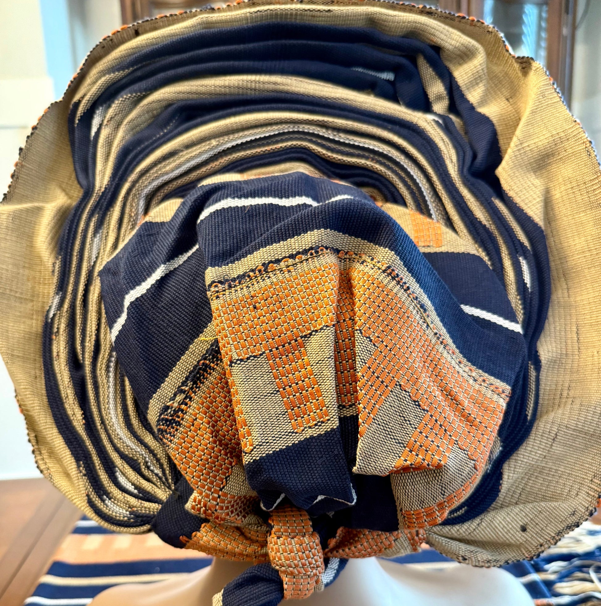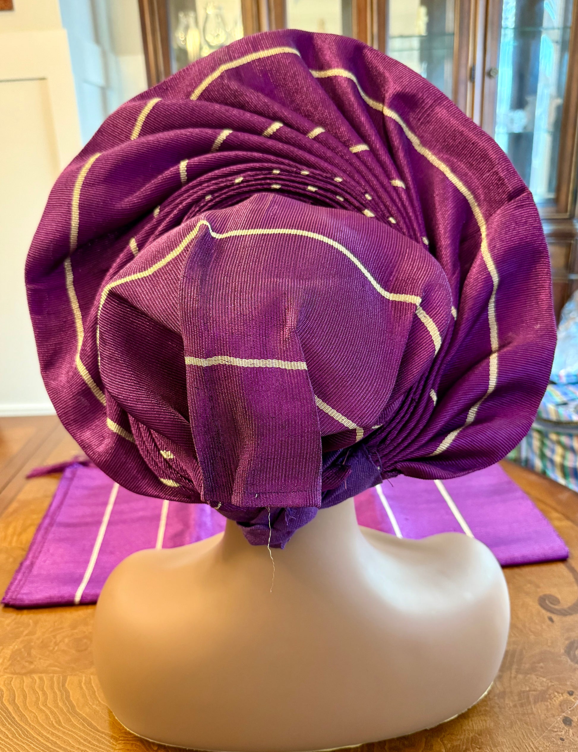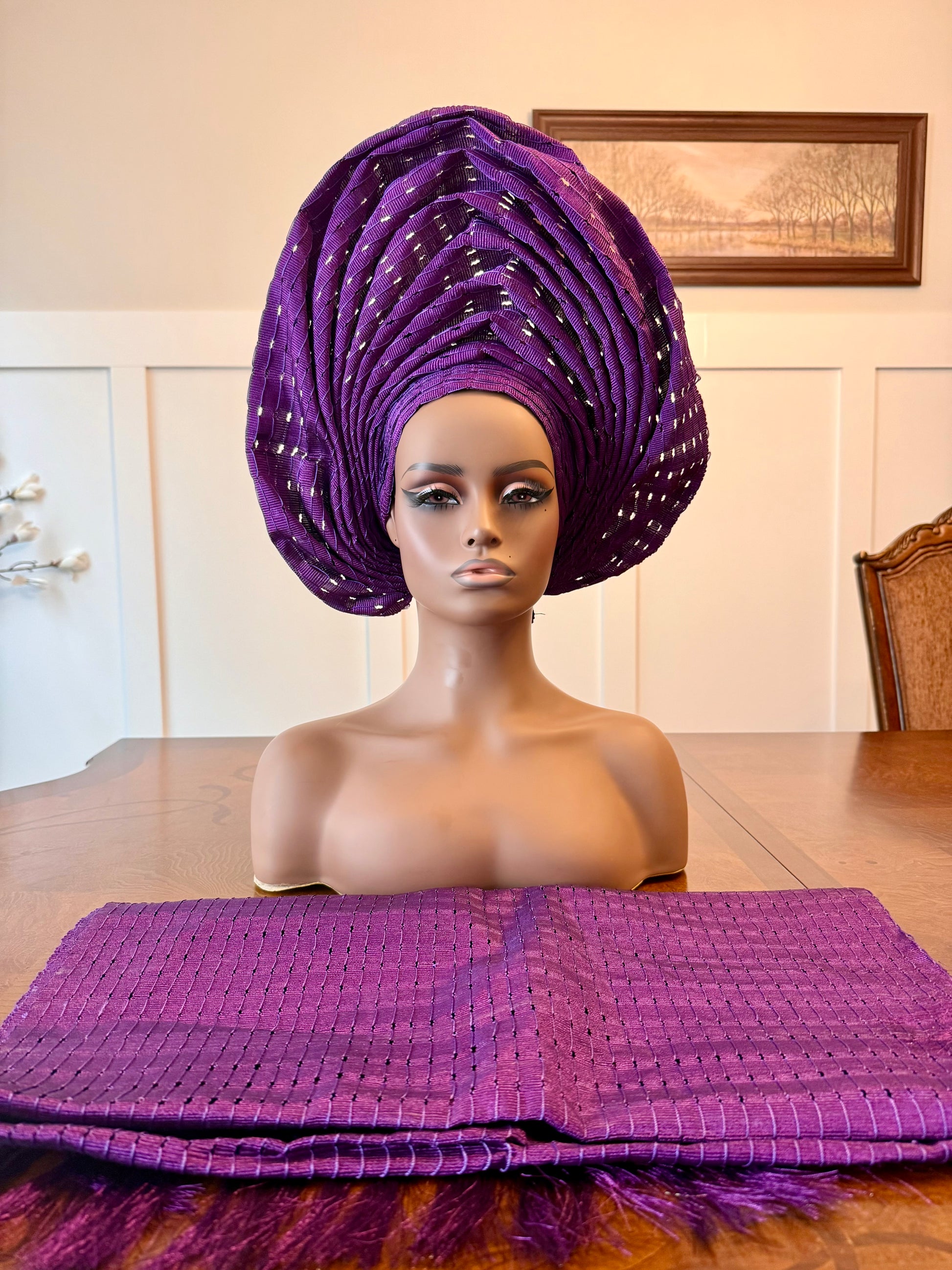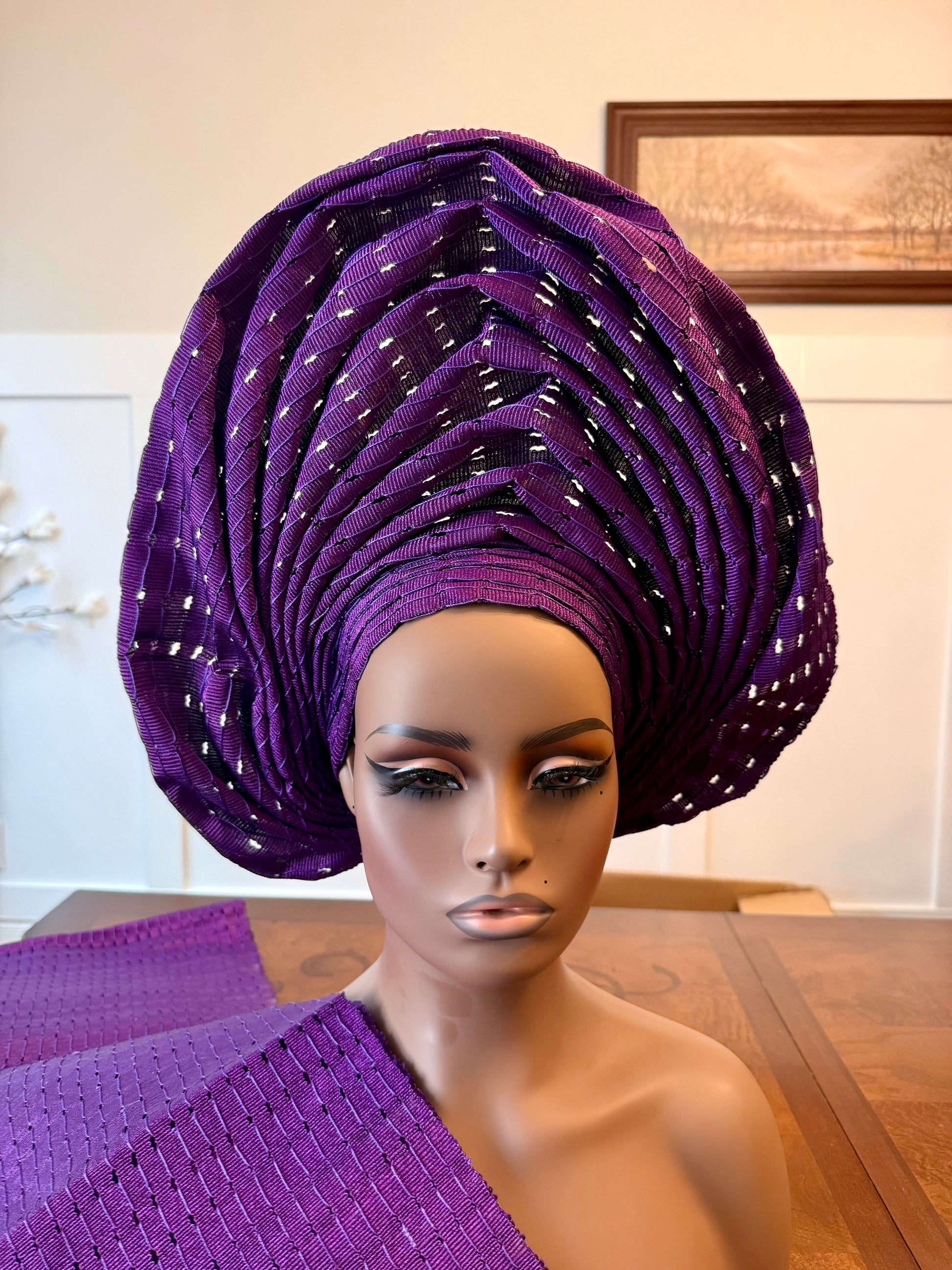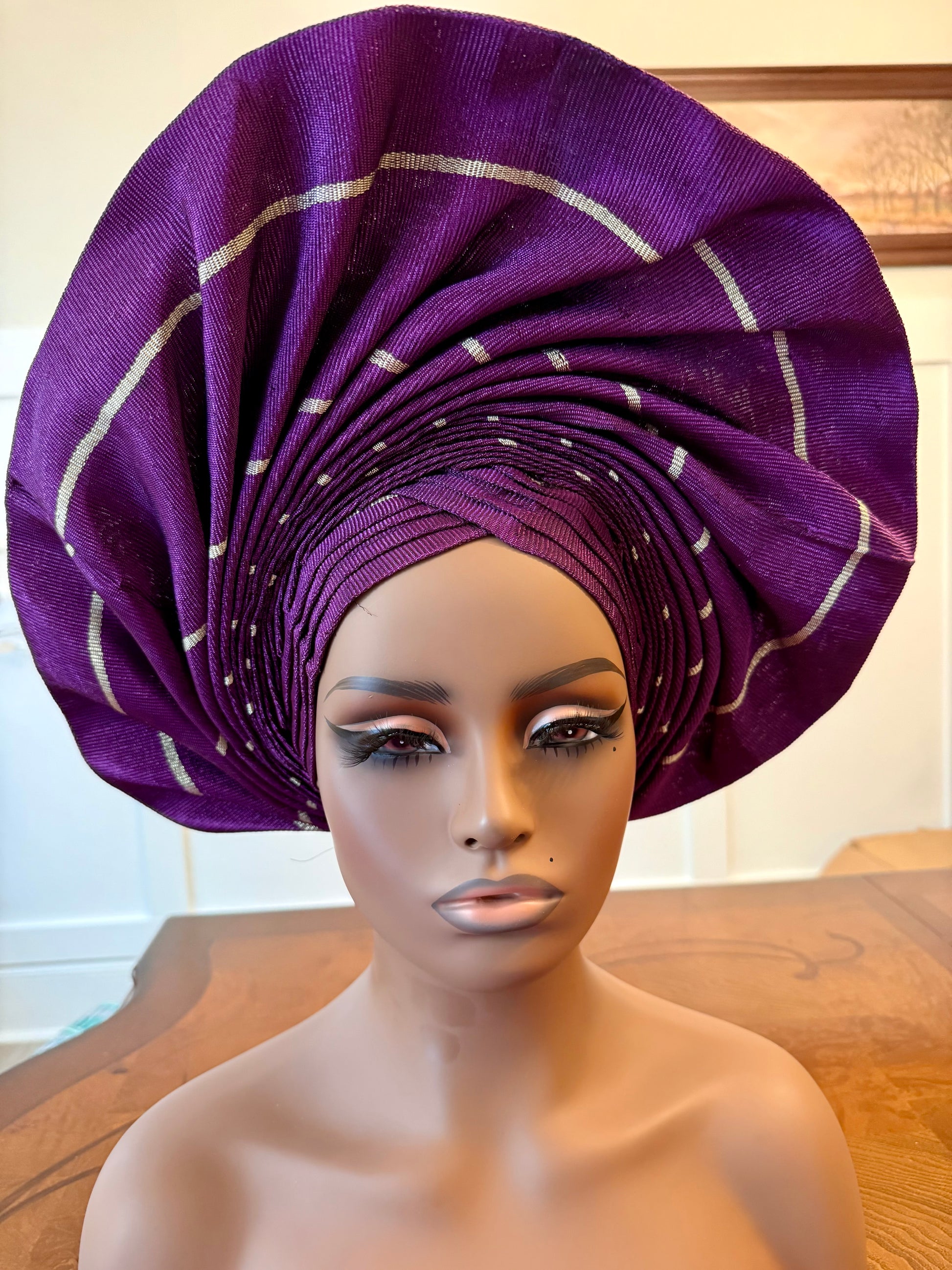 Wide loom Krontext to Cone and Damask Patterned Aso-Oke. This special traditional bridal headwear set is uniquely designed to grace that special occasion. This beautiful African ready to wear headgear is very easy to tie and comfortable, it's gives you that complete African look within a minute.